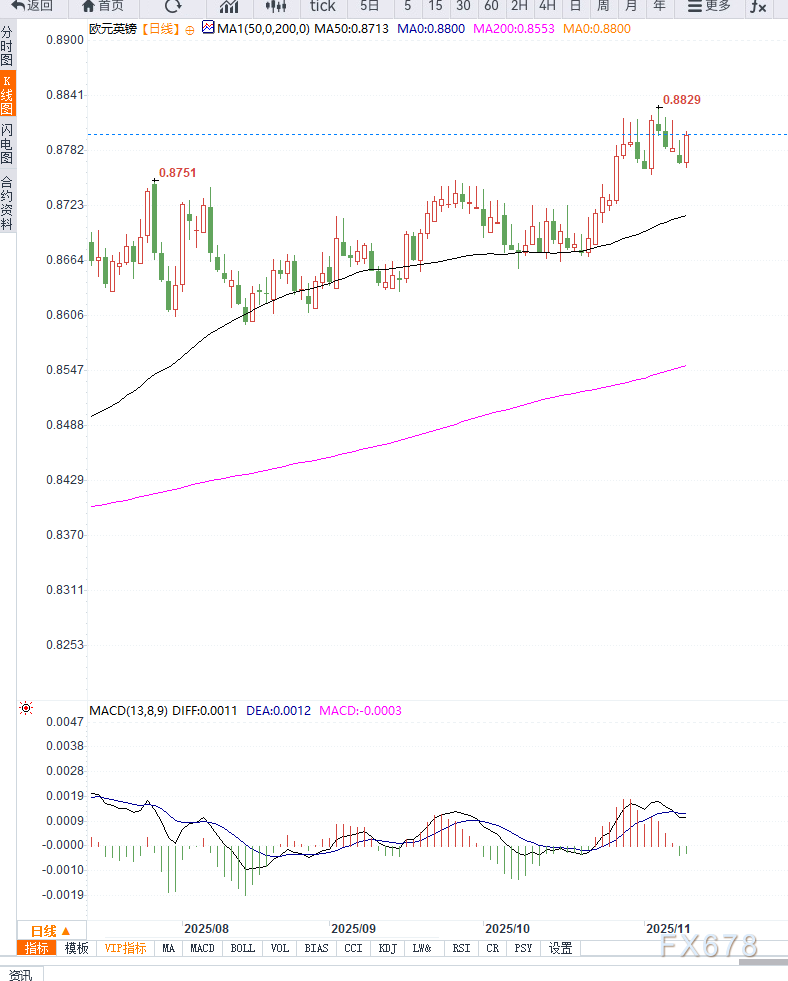 相比之下,欧洲央行维持“观望 + 谨慎”立场,利率政策差异支持 EUR/GBP 延续反弹趋势。