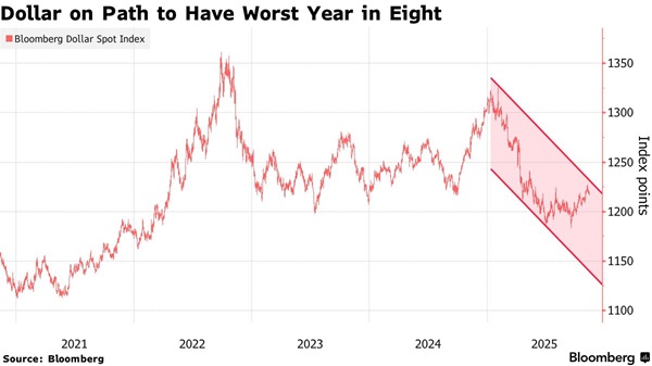 彭博美元指数2025年迄今已下跌约7%,有望创下八年来最糟糕的一年。