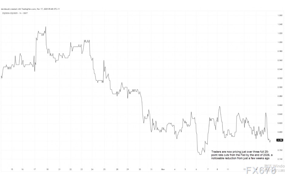 近期市场对降息的定价略有回调,适逢美联储内部偏鹰派的FOMC委员协同发声,试图抑制“12月将连续第三次降息”的市场预期。目前市场对12月降息的预期概率不足46%,而对截至明年底的降息次数预期已缩减至三次——不久前一度预期超过四次25个基点的降息幅度。