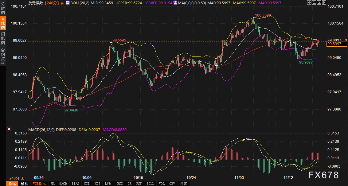 美元指数240分钟图受制于布林带中轨99.3455压制,最新报价99.5921位于中轨与上轨99.6707之间的上半区。MACD指标出现轻微死叉,红柱缩量,显示多头动能衰竭。