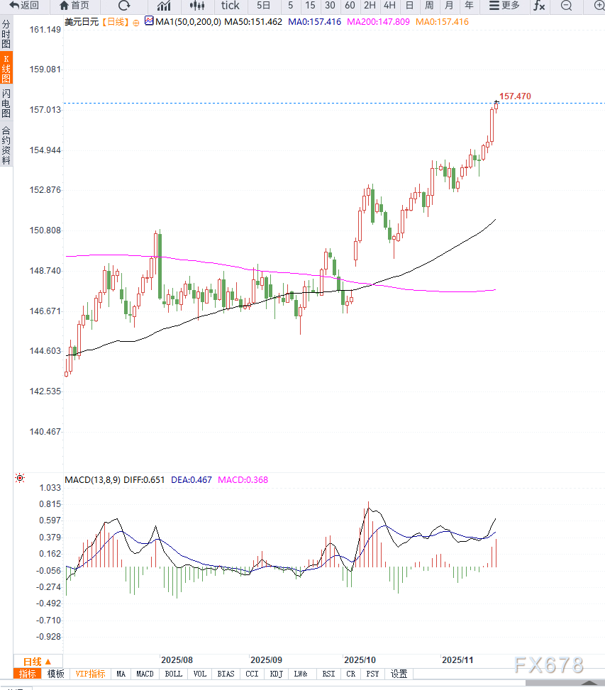 与此同时,美国方面美元重新逼近本月高点,因10月联储会议记录显示内部对于后续操作存在分歧,降低了市场对12月降息的预期。投资者普遍等待延迟发布的美国非农就业报告,以进一步判断联储路径,并间接影响美元兑日元的走势。