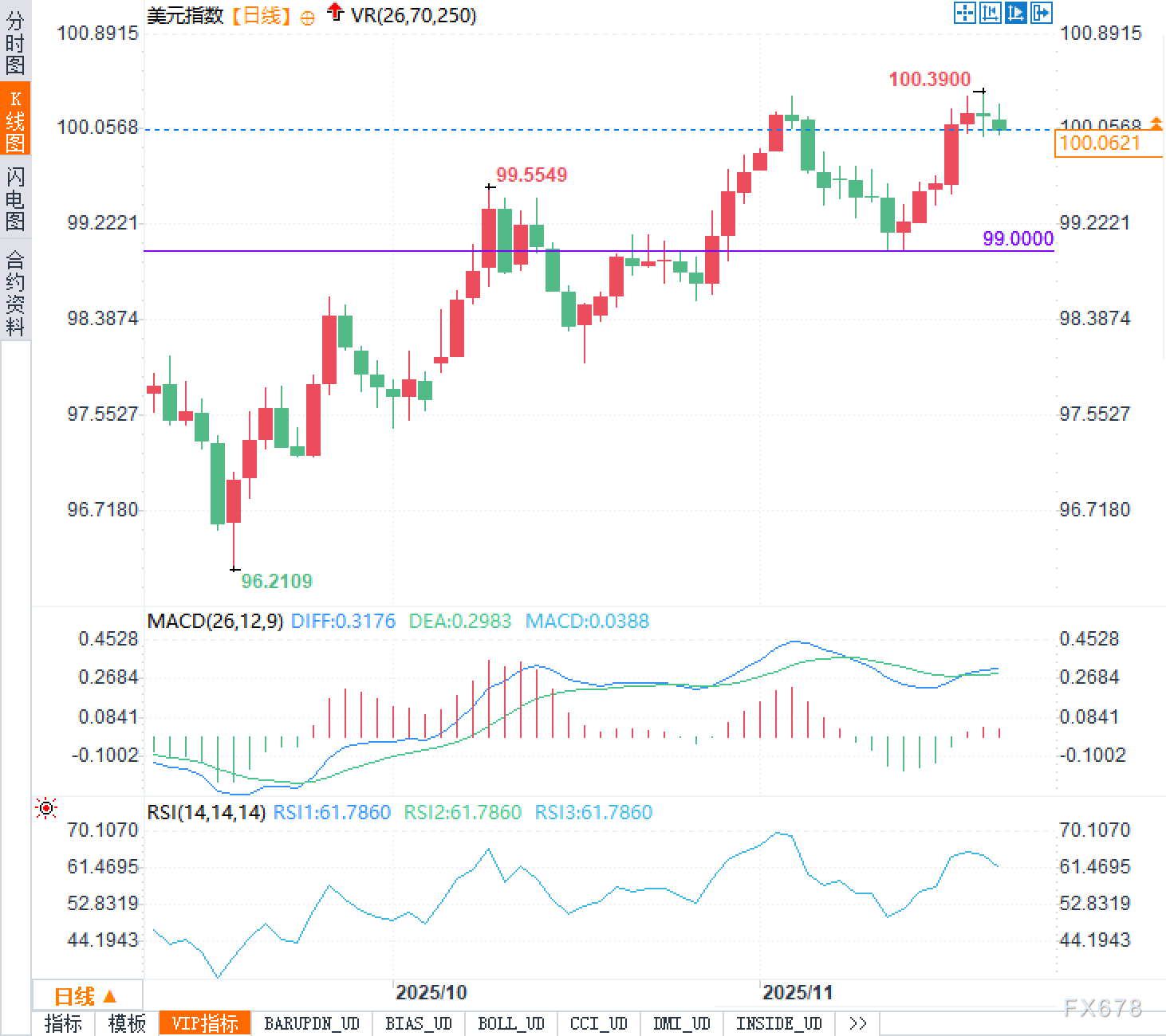 从日线看,美元指数自96.21低点一路抬升,阶段性高点已摸至100.39,目前整体仍处于上升通道的中上部区域,回调多以高位整理为主。MACD位于零轴上方,DIF略高于DEA,维持金叉状态,但柱体较前期有所收窄,显示上行动能仍在,边际强度略有减弱。