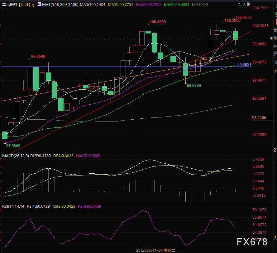 汇通财经APP讯——周二(11月25日)美元指数走出连续破底的下行走势,配合消息跌破了上升趋势线,目前交投于99.96附近,据美国官员称,乌克兰同意和平协议条款,和平协议的一些次要细节仍未敲定,这份19点的乌克兰和平计划中已不再包含赦免条款,市场避险情绪缓解,美元指数承压。