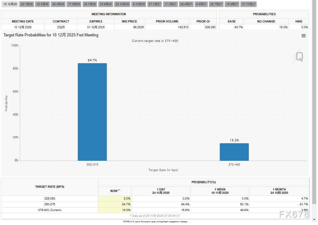 芝商所美联储观察工具(CMEFedWatchTool)数据显示,交易员当前对12月25个基点降息的定价概率已攀升至近85%,较一周前30%的水平实现跨越式增长。