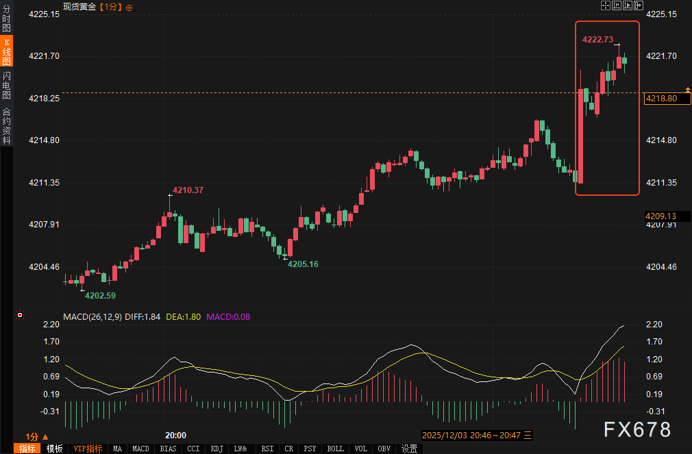 汇通财经APP讯——周三(12月3日)北京时间21:15,美国ADP就业报告公布,私营部门11月新增就业岗位减少3.2万个,远低于市场预期的微增1万。这是自2020年6月以来最差单月表现,显示劳动力市场下行压力加大。数据公布后,市场对美联储降息的预期显著上升,美元指数短线下挫约8个点,最低触及98.8840;现货黄金短线拉升近10美元/盎司,最高报4221.25美元/盎司。美股期货波动有限,但避险情绪主导盘中走势,投资者关注这一数据对宏观政策路径的影响。