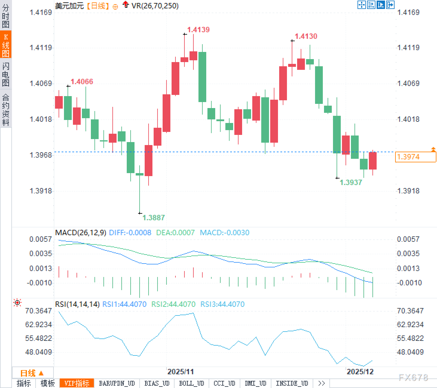 日线图显示,美元兑加元自11月中旬触及阶段高点1.4139后进入调整周期,随后形成明显的下降趋势。汇价于近期下探至1.3937低点,创出五周以来新低,随后展开技术性反弹,当前交投于1.3974一线。从K线形态观察,近两个交易日呈现探底回升特征,昨日收出带有较长下影线的阳线,显示多头在关键支撑区域具备一定承接意愿。