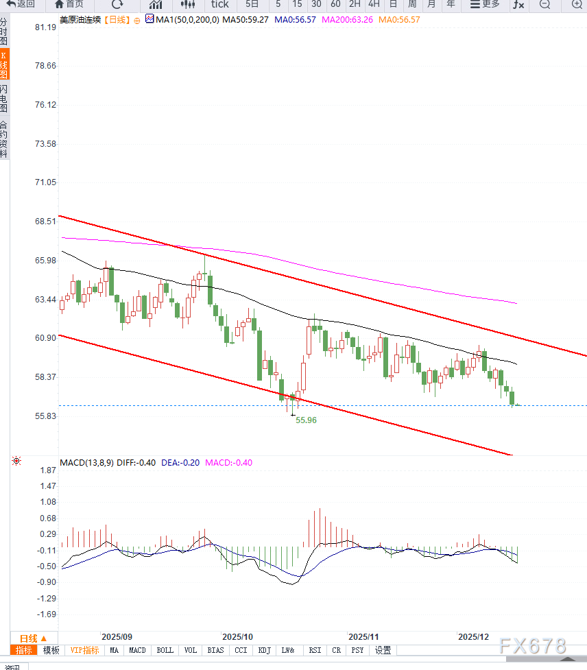 从日线图形上来看,油价仍运行在中期下降通道内,反弹动能不足。上方首先关注前期反弹高点57.80美元/桶区域,若无法有效突破,空头趋势难以扭转。下方关注前低56.00美元支撑,一旦放量跌破,可能引发新一轮技术性抛售。