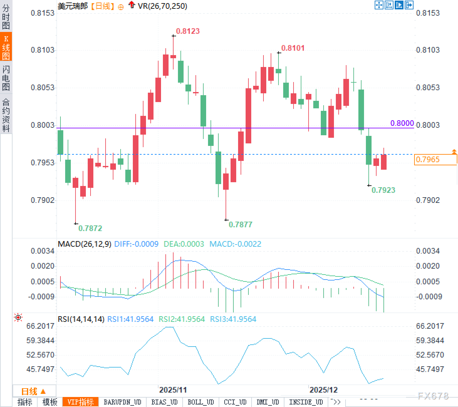 美元兑瑞郎在欧洲早盘时段维持在0.7960至0.7965区间内窄幅波动,整体交投氛围趋于谨慎。从日线图表来看,汇价近期经历了较为明显的回调过程,从0.8101的阶段高点持续下行,一度探及0.7923的低位,随后展开技术性反弹。当前汇价在0.7960附近获得一定支撑,但上方0.8000整数关口构成短期阻力。技术指标方面,相对强弱指数(RSI)处于41.95附近,位于中性偏弱区域,显示多空力量尚未形成明确优势。MACD指标则呈现负值运行态势,短期动能偏向空方。
