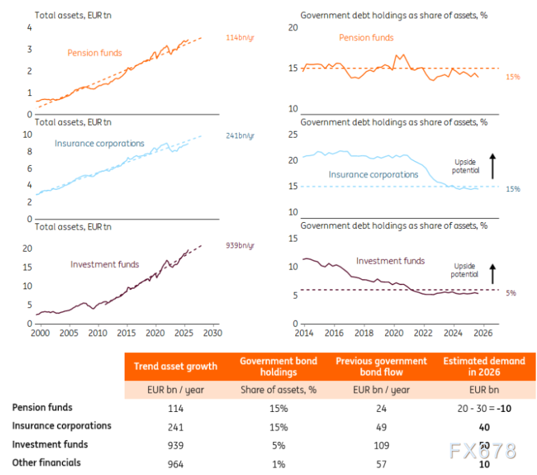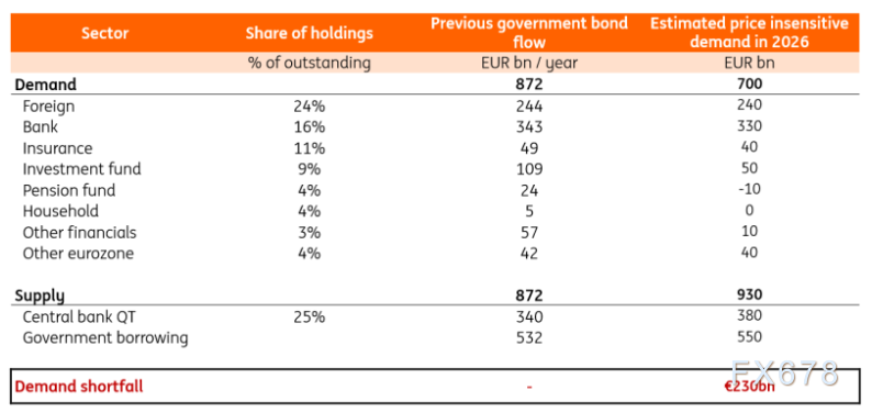但荷兰养老金改革触发了政府债券需求的结构性下降,预计规模约为1000亿欧元。其中很大一部分可能要到2027年才会发生,但在2026年,我们预计荷兰养老金基金的净卖出额约为300亿欧元。因此,2026年的总需求将减少约100亿欧元。话虽如此,养老金基金在增加政府债券购买方面可以相当灵活,但这当然需要与其他资产类别相比具有吸引力的收益率。