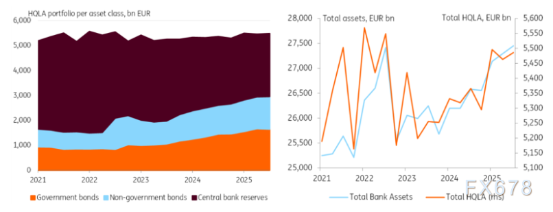 最新数据显示,银行每年购买约3400亿欧元的政府债券,并将继续成为欧元区最大的买家。监管要求银行持有高质量流动性资产(HQLA)以覆盖流动性流出,从而增加了对政府债券的需求。随着QT导致央行储备从体系中撤出,银行必须用其他HQLA补充其流动性组合,以维持恒定的流动性覆盖率(LCR)。非储备HQLA中约55%为政府债券。因此,替换3800亿欧元的储备金将产生约2100亿欧元的政府债券需求。
