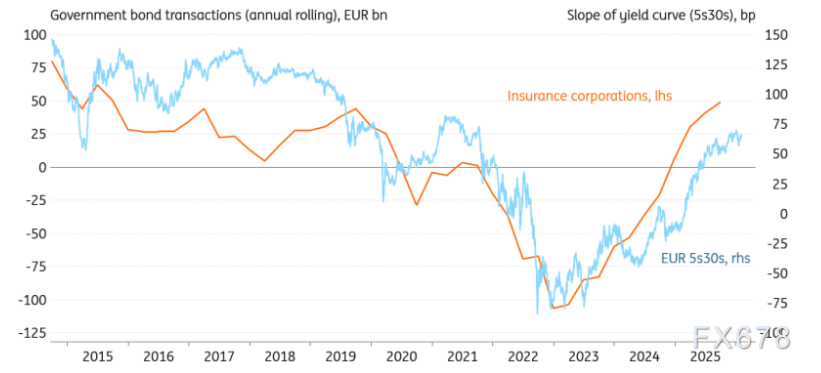 外国投资者的强劲需求可能会持续,因为目前的持仓量仍远低于量化宽松(QE)前的水平。在量化宽松之前,外国投资者持有的债务占总流通债务的比例超过27%,远高于目前的24%。最新数据显示,年度需求为2450亿欧元,仅次于欧元区银行。