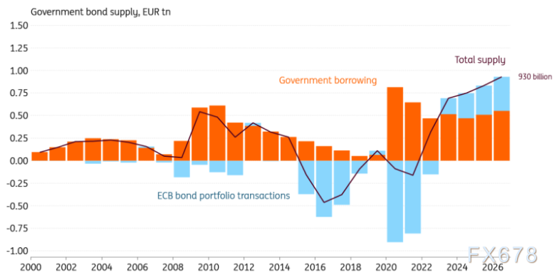 市场成功吸收了1月份的第一波发行,但分析表明利率可能需要进一步上升。2026年,欧洲政府债券的净供应量将达到创纪录的9300亿欧元。2026年政府发行量约为5500亿欧元,而欧洲央行的量化紧缩(QT)计划预计将为市场带来另外3800亿欧元的供应。