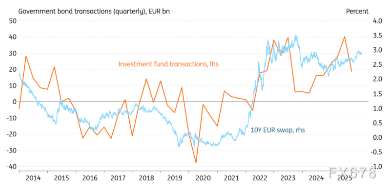 最大的潜力可能来自投资基金,但这些基金对价格也非常敏感。交易量与10年期互换利率之间的正相关性表明,投资基金在利率较高时买入,在利率较低时卖出。话虽如此,过去几年政府债务证券的持有量占资产的比例已稳定在5%左右。基于这一假设,资产再增长5%的一年将带来500亿欧元的额外政府债券需求。这可能更多取决于股票价格,因为股票占基金资产的大部分。再次强调,如果收益率上升到足够高的水平,投资基金可能会倾向于更多地转向政府债券。