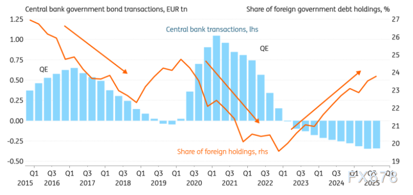 其他外国投资者,例如私人金融公司,可能是对价格更敏感的买家。当欧洲央行大量购买政府债券时,收益率会被压低,从而将外国买家挤出市场。相反,在当前的量化紧缩阶段,随着收益率上升,外国投资者又被吸引回来。